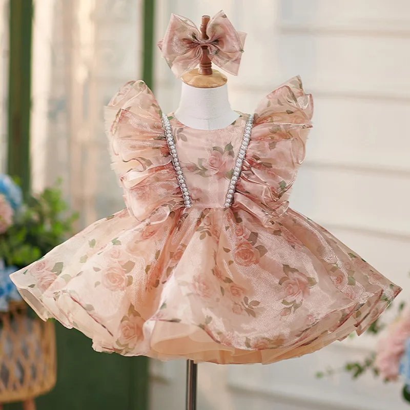 luxury elegant rose print tulle pomace skirt baby dress, first birthday dress suitable for a variety of special occasions high-e