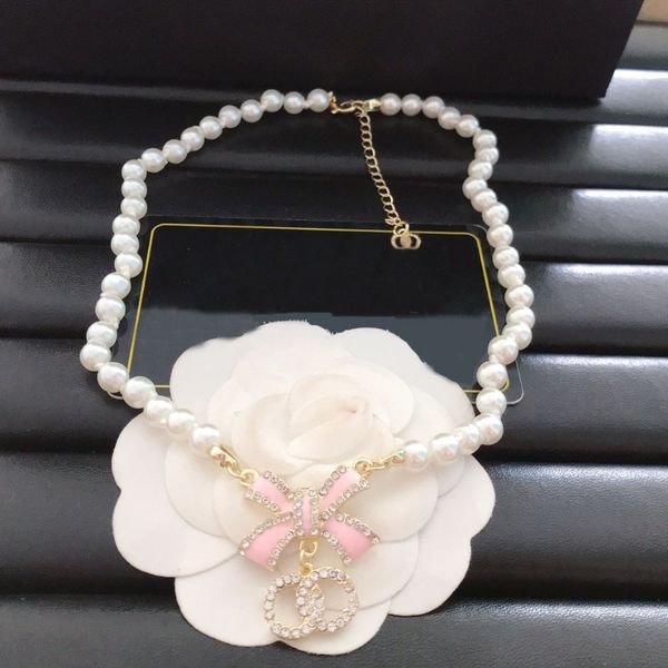 Luxury Pearl Necklace Earrings Set Designer Women Bow Pendant Gold Plated Crysal Choker Wedding Party Jewelry Gift