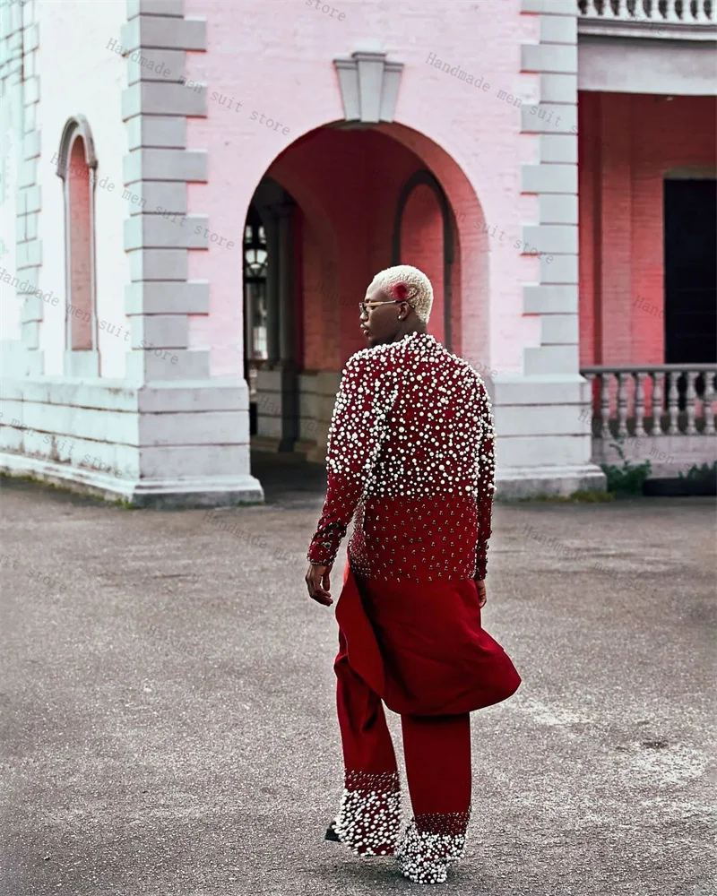 Luxury Red Men Suits 2 Piece Long Blazer+Pants Crystals Pearls Wedding Tuxedo Prom Coat Customized Formal Office Jacket Trousers