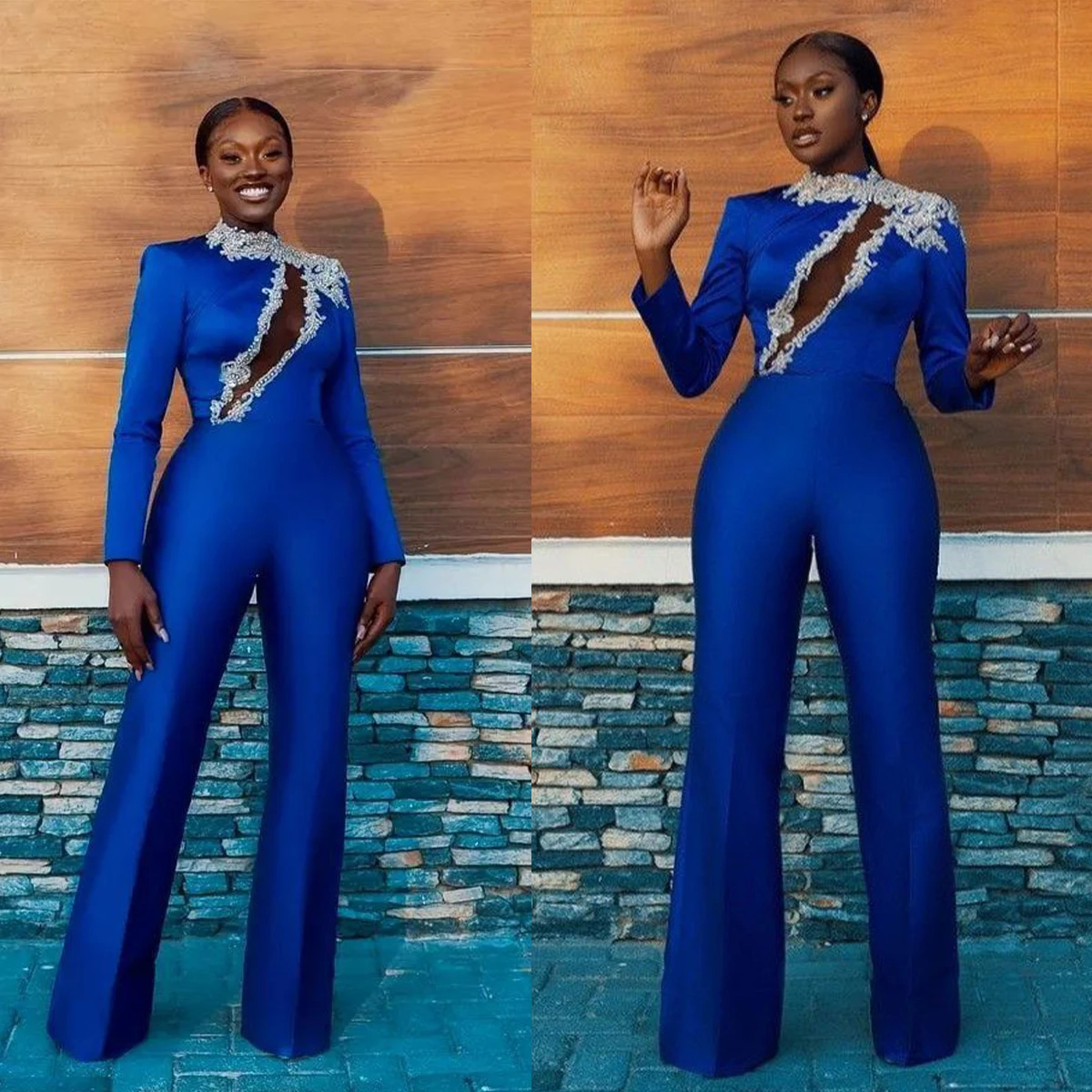 Luxury Women Pants Suits One Piece Royal Blue Beaded Lace Carved Jumpsuits Plus Size Customized Evenings Party Celebrity Outfit