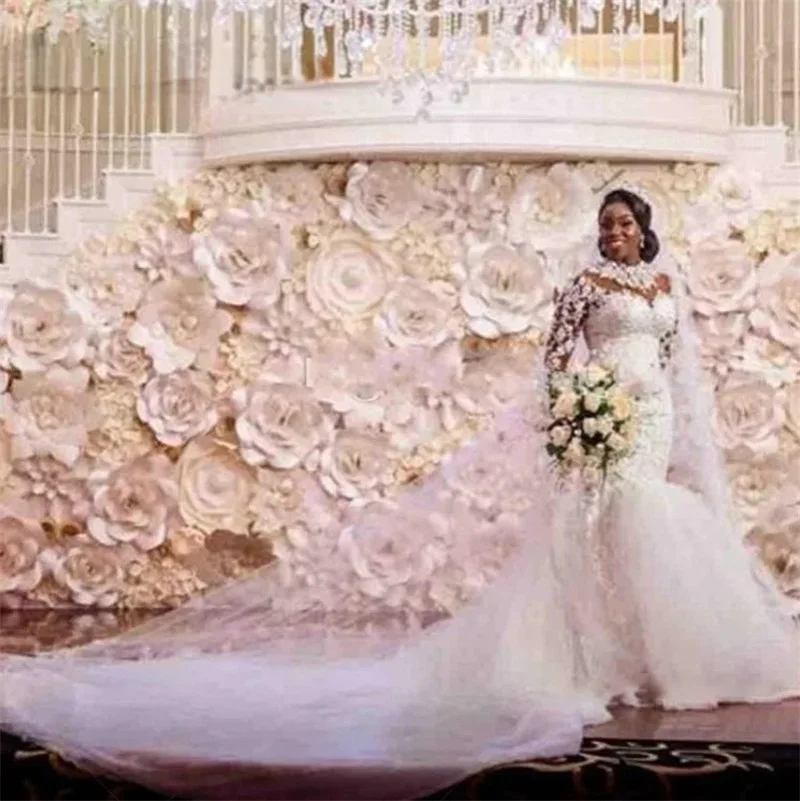 Luxury Women Wedding Dress Sexy Sheer Sleeves Full Sleeves Appliqued Beads Mermaid Bridal Gown Formal Birthday Red Carpet Robe