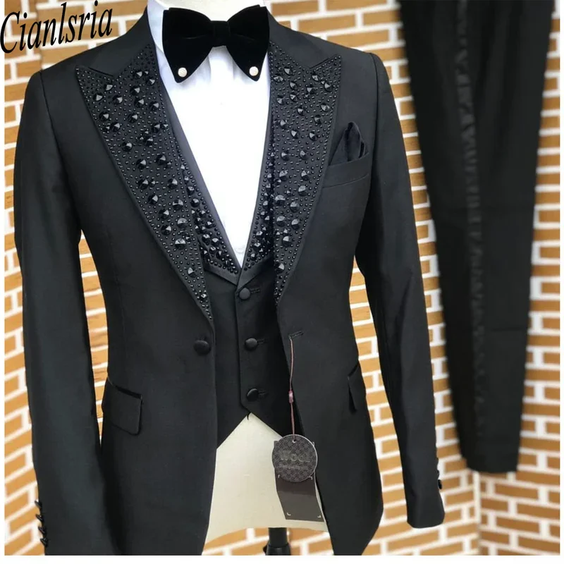 Black Formal Men Business Beading Sequined Occasion Tuxedos Grooms Wedding Party Prom Male Suit 2 Piece Set Blazer Pants
