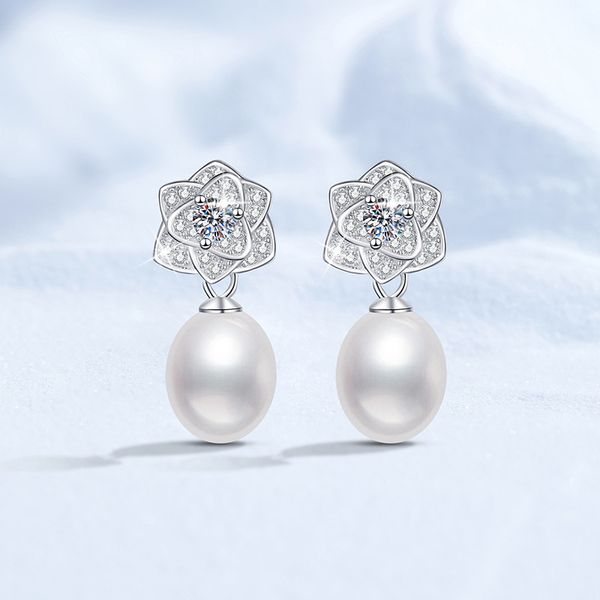 Moissanite Stud Earrings S925 Sterling Silver with Natural Freshwater Pearls, Camellia Flower Design, High-End Fashion Earrings for Women, Wholesale