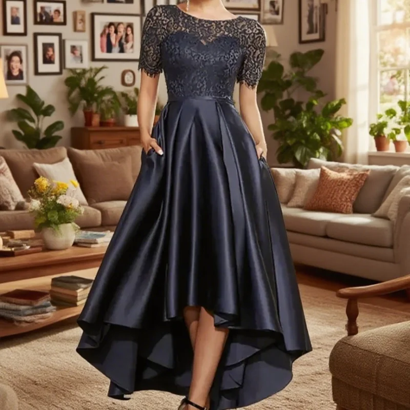 Mother of the Bride Dresses Dark Navy A-Line Wedding Guest Dress Lace Satin Short Sleeve Groom Mom Prom Evening Gowns Customized