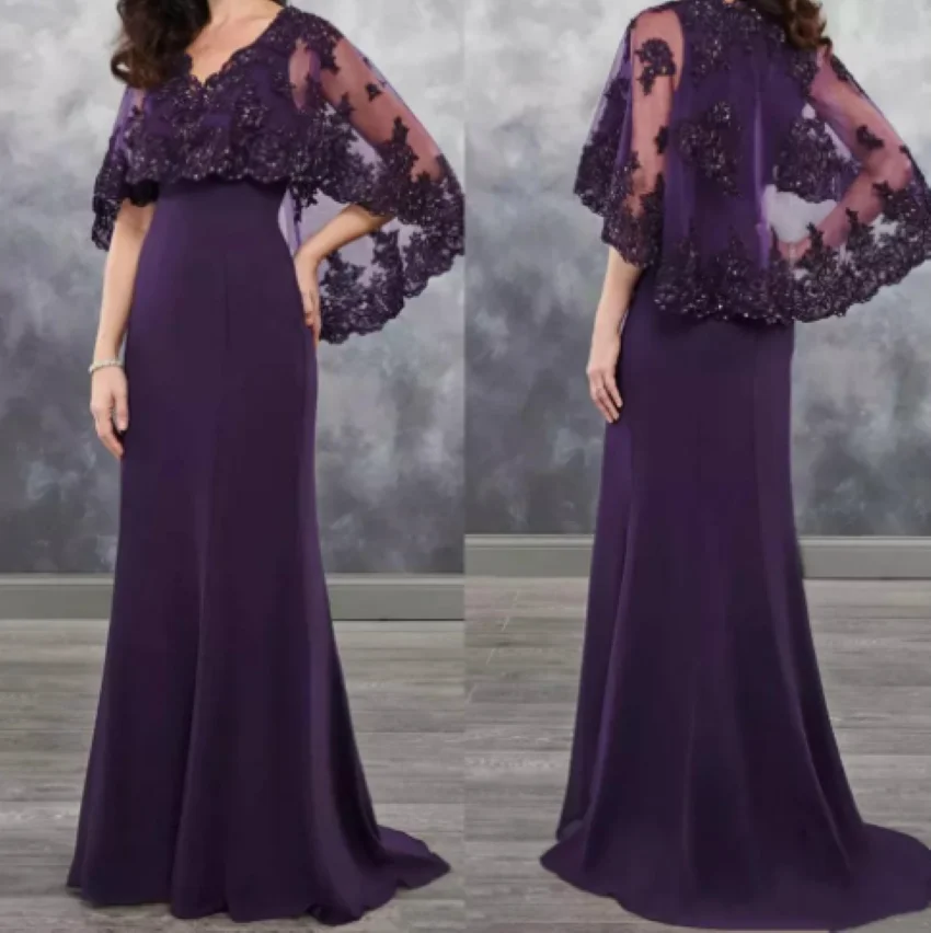 Mother of the Groom Evening Gowns Long Purple Mother of the Bride Dress with Cape Shawl Wrap Sparkly Sequiues Satin Floor-Length