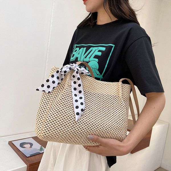Myyshop Summer Fashion Straw Leisure Women's Bags with Silk Scarf Bow One Shoulder Slung Bucket Bag 2Colors Khaki/Beige PB0012