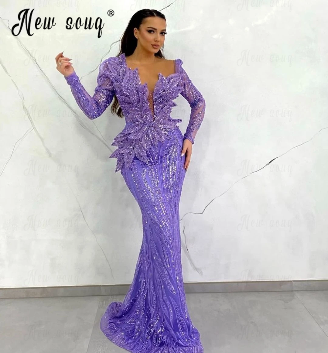 Item: New Arrival Lilac Evening Dress V Neck Long Sleeve Wedding Prom Gowns With Leaf Design Mermaid Plus Size Party Dress Customized