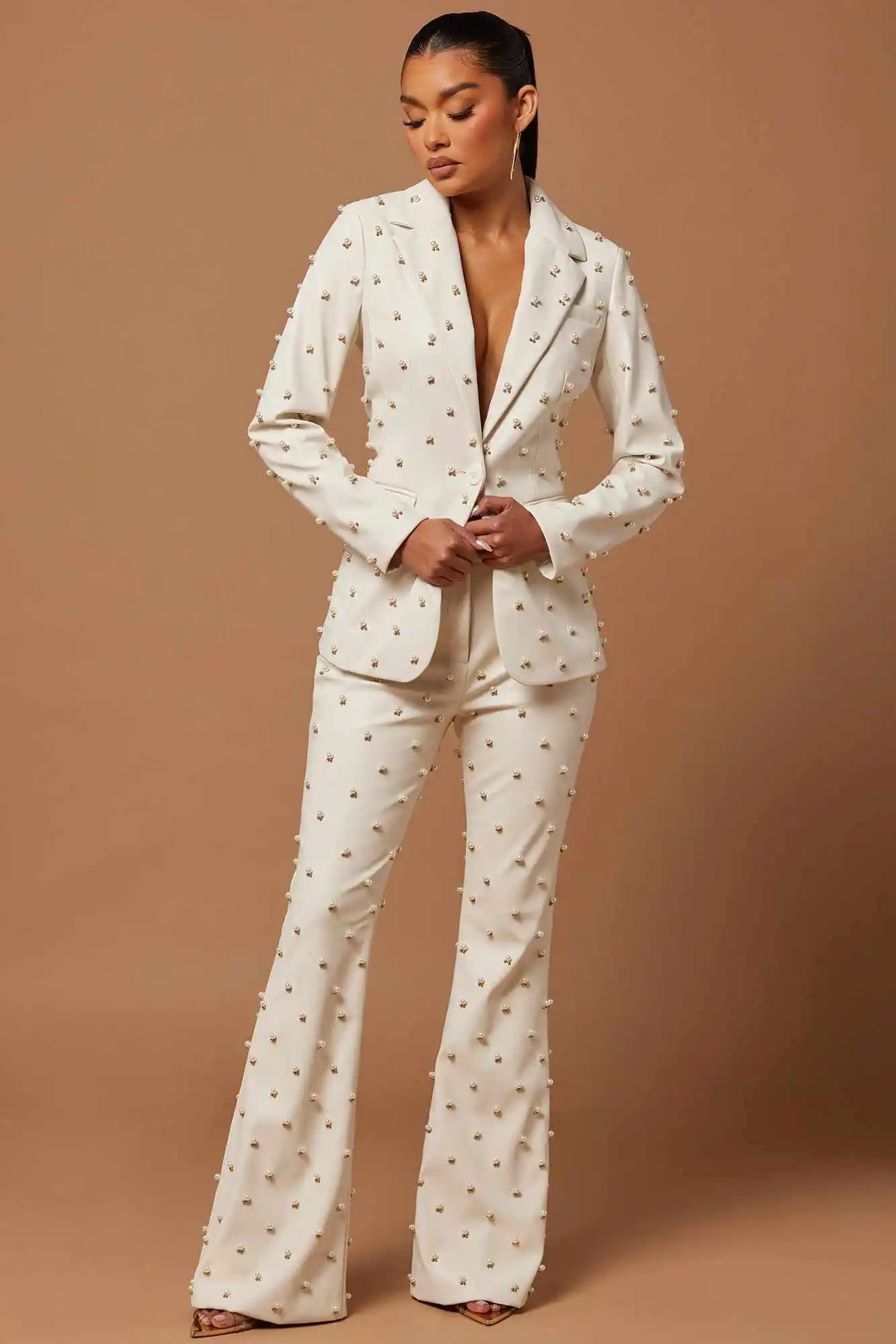 Item: New Design Leather Pearls Women Suit Pant 2-Pieces Blazer+Trousers Sexy V Neck Single Breasted Office Lady Jacket Custom Made