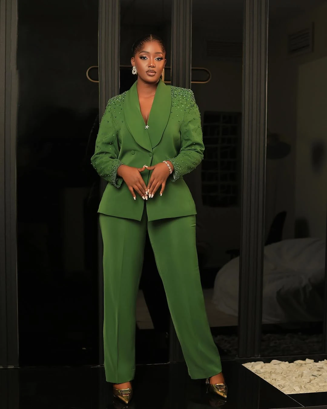 New Design Tailored 2 Pieces Women Suits Blazer Pants Shawl Lapel Double Breasted Beading Sequins Stylish Women Suits Customized
