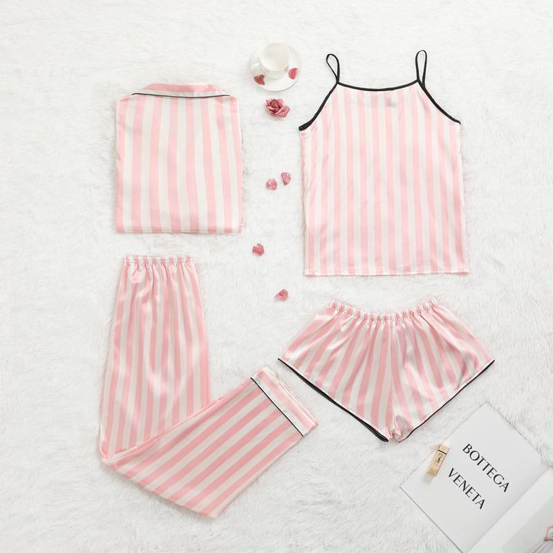 new spring and summer fashion women’s ice silk four-piece suspender pajamas women’s thin striped sweet home clothes