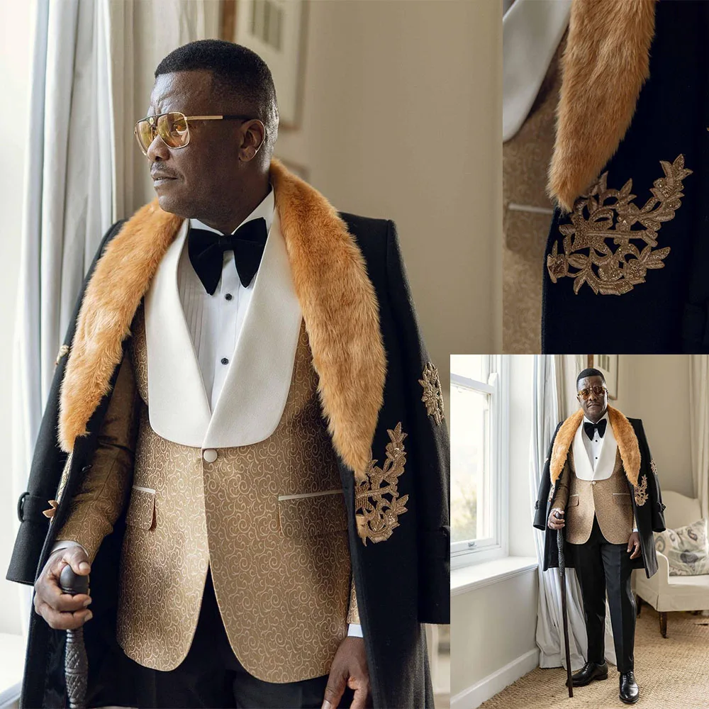 New Winter Man Overcoat Luxurious Long-length Plush Collar Men Suits Appliques Cashmere One-Piece Jacket Custom Wedding Tuxedos