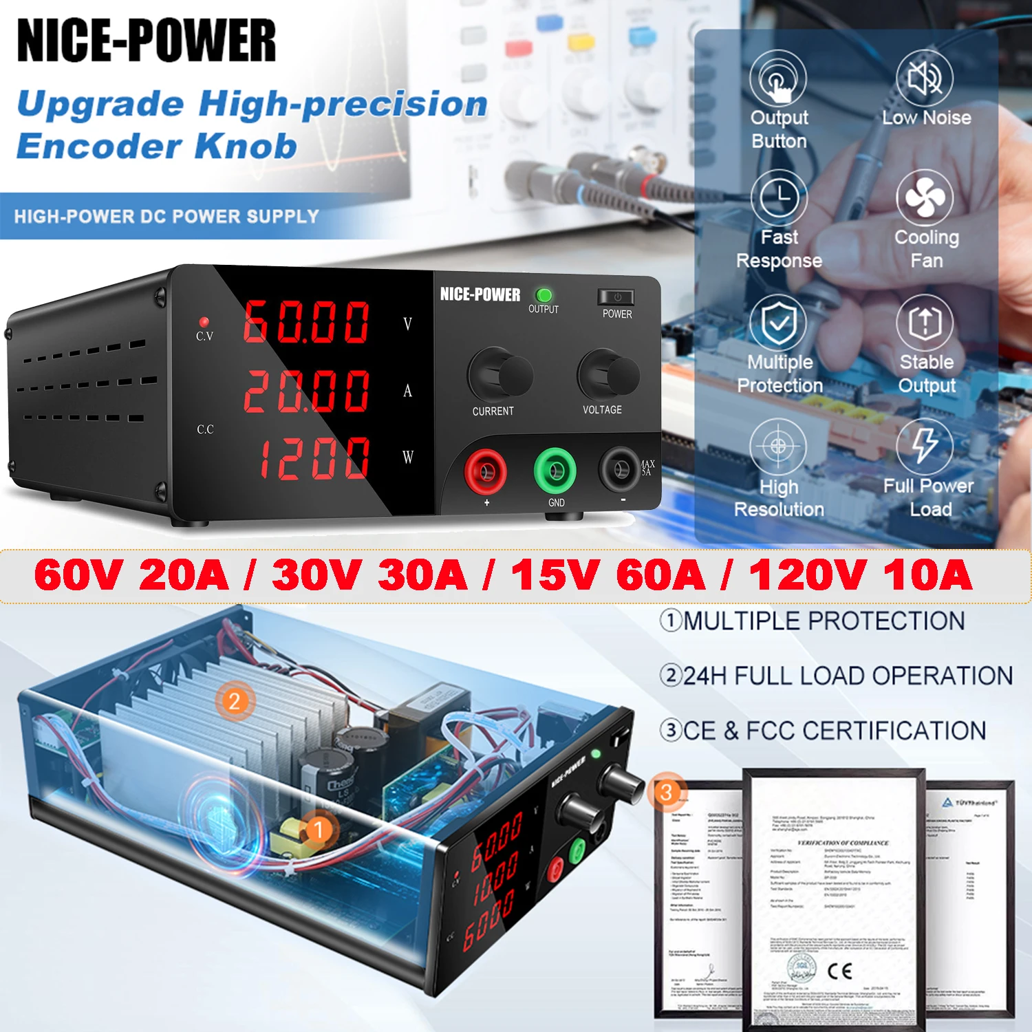 NICE-POWER DC Power Supply Variable 60V 20A 1200W Bench Power Supply Output Switch Encoder Knob 15V 60A/30V 30A/120V 10A/200V 5