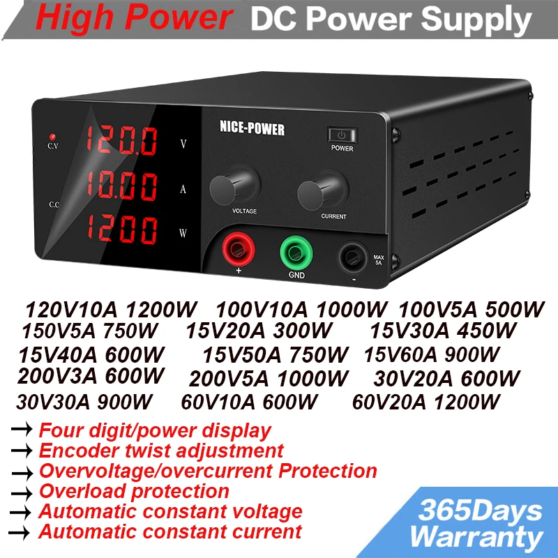 NICE-POWER High Power Bench LAB DC Power Supply 300W-1200W 120V 10A Voltage Current Regulator 15V 30V 60V 100V 200V 10A 20A 60A