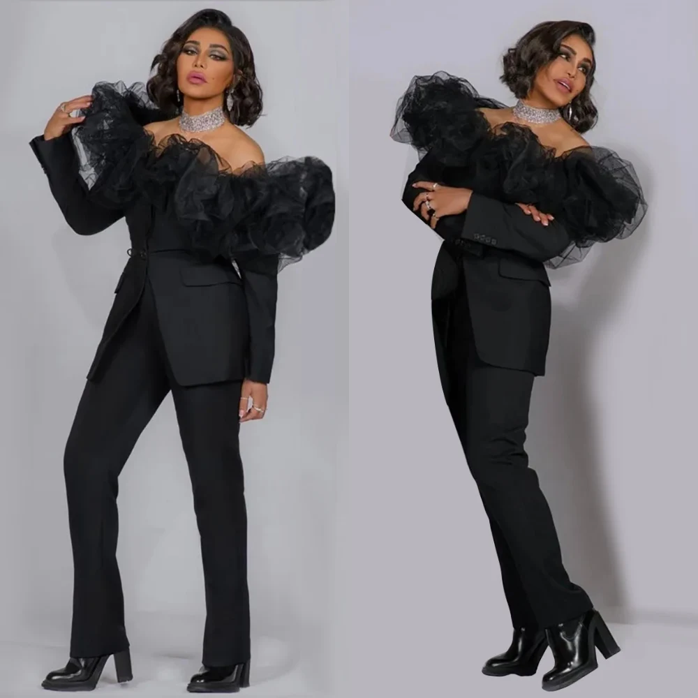 Off Shoulder Women Pants Suits 2 Pieces Formal Office Lady Ruffles Jacket For Photograph Prom Wear Wedding Tuxedos
