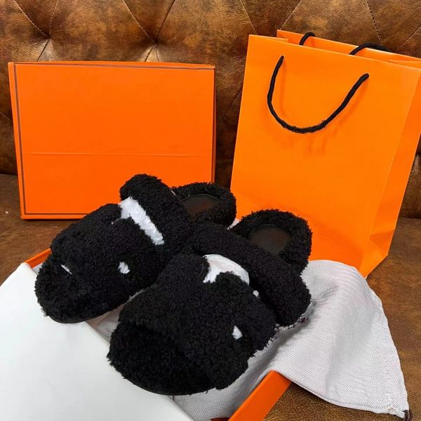 Orange Designer Slippers Women Lamb Wool Slides New Fashion Fur Platform Shoes Luxury Brand Winter Warm Soft Open Toe Outdoor One Strap Flat Heel Fluffy Plush 36-41