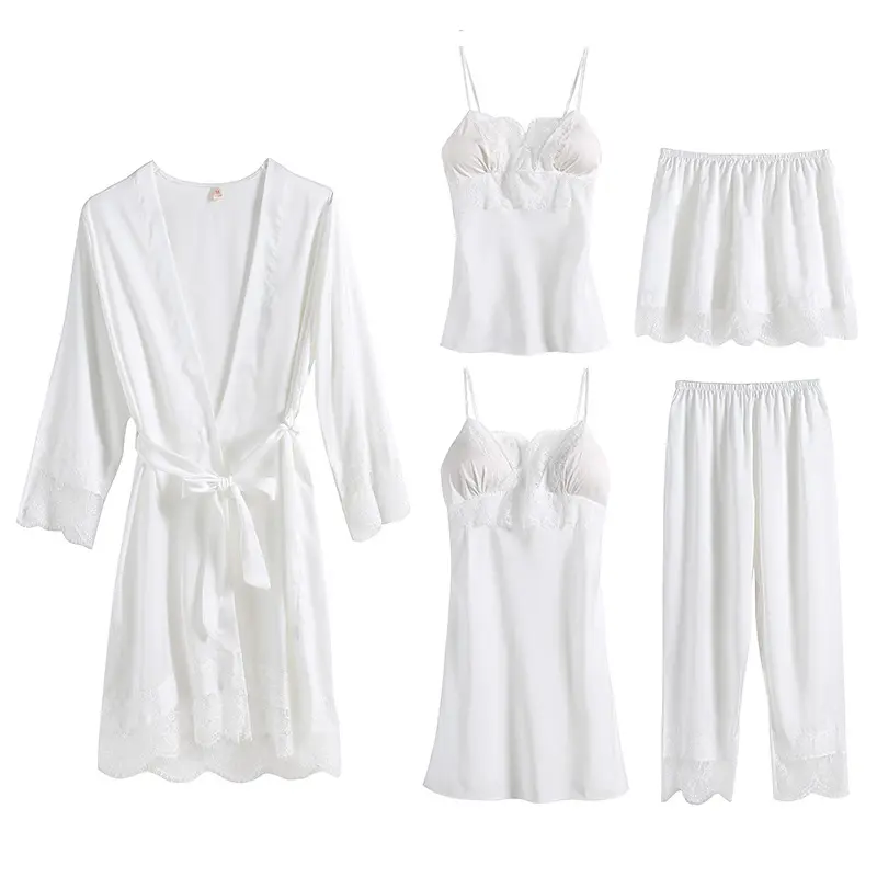 Pajamas female spring and fall ice silk long-sleeved halter nightgown five-piece set with chest pad sexy lace lace homewear winter