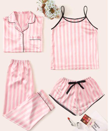 Description: Serene Embrace: The Summer Nights – Luxurious Silk Pajama Set Indulge in the ultimate comfort and allure of our Serene Embrace Silk Pajama Set, meticulously crafted for the modern woman seeking a touch of timeless luxury and irresistible style. This isn’t just a pajama set; it’s an experience – a promise of blissful relaxation and confident evenings. A Symphony of Silhouettes & Sophistication: This exquisite set is designed to evoke a feeling of effortless glamour. Featuring a flattering, high-quality silk blend, each piece is exquisitely soft against the skin, offering a remarkable level of comfort that transcends mere material. The set is a harmonious blend of vertical stripes, a subtle design that adds a touch of visual interest and creates a sophisticated aesthetic. The Core Pieces – Crafted with Precision: Short-Sleeved Shorts: The shorts are a pivotal element, constructed from a dense, premium silk that drapes beautifully and flows with your movements. They’re tailored to offer a comfortable, yet surprisingly flattering fit, designed to elongate the legs. The strategic placement of the seams provides a clean, streamlined silhouette. The shorts are generously cut, offering a relaxed yet polished look. They’re perfect for a casual evening, a cozy night in, or a romantic rendezvous. Tops – Vertical Stripes: The tops are meticulously designed to showcase the subtle elegance of vertical stripes. These aren’t just simple stripes; they’re a carefully considered design that adds depth and visual appeal. The fabric is a luxurious silk, ensuring a smooth, gentle drape. The top design is balanced – offering a flattering neckline and a comfortable, relaxed fit that minimizes lines. They’re perfect for layering or wearing on their own. Pajama Pants: These pants are the pièce de résistance of this set. Constructed from a breathable silk blend, they provide ultimate comfort and a luxuriously soft feel. The high waist creates an elegant silhouette, highlighting the waist and flowing down the hips. The wide leg allows for comfortable movement while maintaining a graceful aesthetic. The deep pockets offer convenient storage for essentials. The Design Details – A Luxurious Finish: Vertical Stripes: The consistent vertical stripes offer a subtle yet impactful visual interest. They create a sense of depth and add a touch of bohemian flair without being overly bold. Silk Blend Fabric: The silk is chosen for its superior drape, softness, and luxurious feel. It’s a premium material that resists wrinkling and retains its shape even after repeated washing. The fabric will have a subtle sheen and a gentle, luxurious texture. Comfort & Drape: The silk blend is designed to drape beautifully, creating a flattering silhouette that enhances the natural form of the body. The fabric’s ability to move with you makes it incredibly comfortable, allowing for relaxed and uninhibited movement throughout the night. Color Palette: The color palette is subtly sophisticated – think soft shades of pale pink, lavender, and ivory, reminiscent of a twilight sky. These colors are consistently used to create a timeless and elegant aesthetic. Quality Construction: Every seam and stitch is meticulously executed, ensuring exceptional durability and a flawless finish. The set is built to last, providing long-lasting comfort and style. Wearability & Confidence: This Serene Embrace Silk Pajama Set is more than just a garment; it’s an investment in your well-being and a symbol of effortless style. Slip into this set and radiate confidence as you embrace the simple pleasures of a blissful night. It’s the perfect blend of comfort, sophistication, and understated luxury – ideal for a night of pampering or a special occasion. Experience the difference of truly luxurious sleepwear. Care Instructions: Hand wash cold, lay flat to dry. Do not bleach. Order yours today and elevate your sleep experience!
