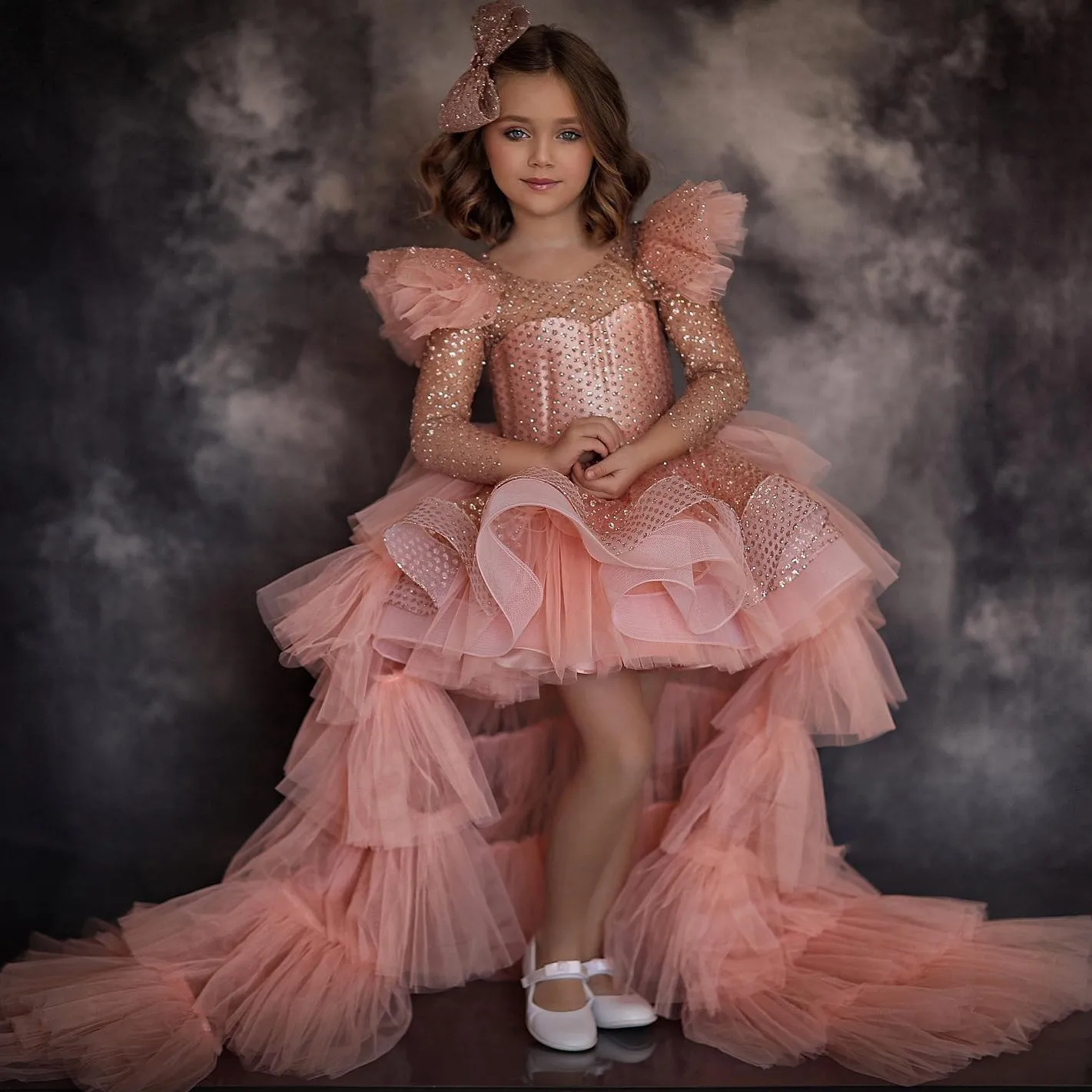 Item: Peach Pink High Low Tutu Tulle Kid Formal Dresses Shiny Daughter Birthday Party Dresses Full Sleeves Tiered Tulle Child Dress
