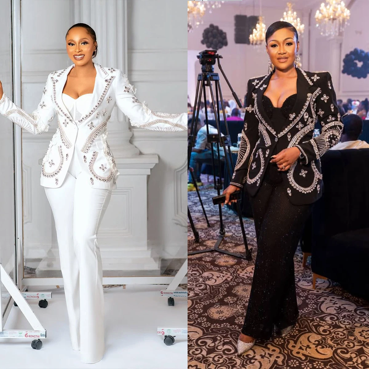 Peaked Lapel Crystal Women Blazer Suits 2 Pieces Beaded Applique African Jacket Customized Wide Leg Pants Celebrity Party Dress