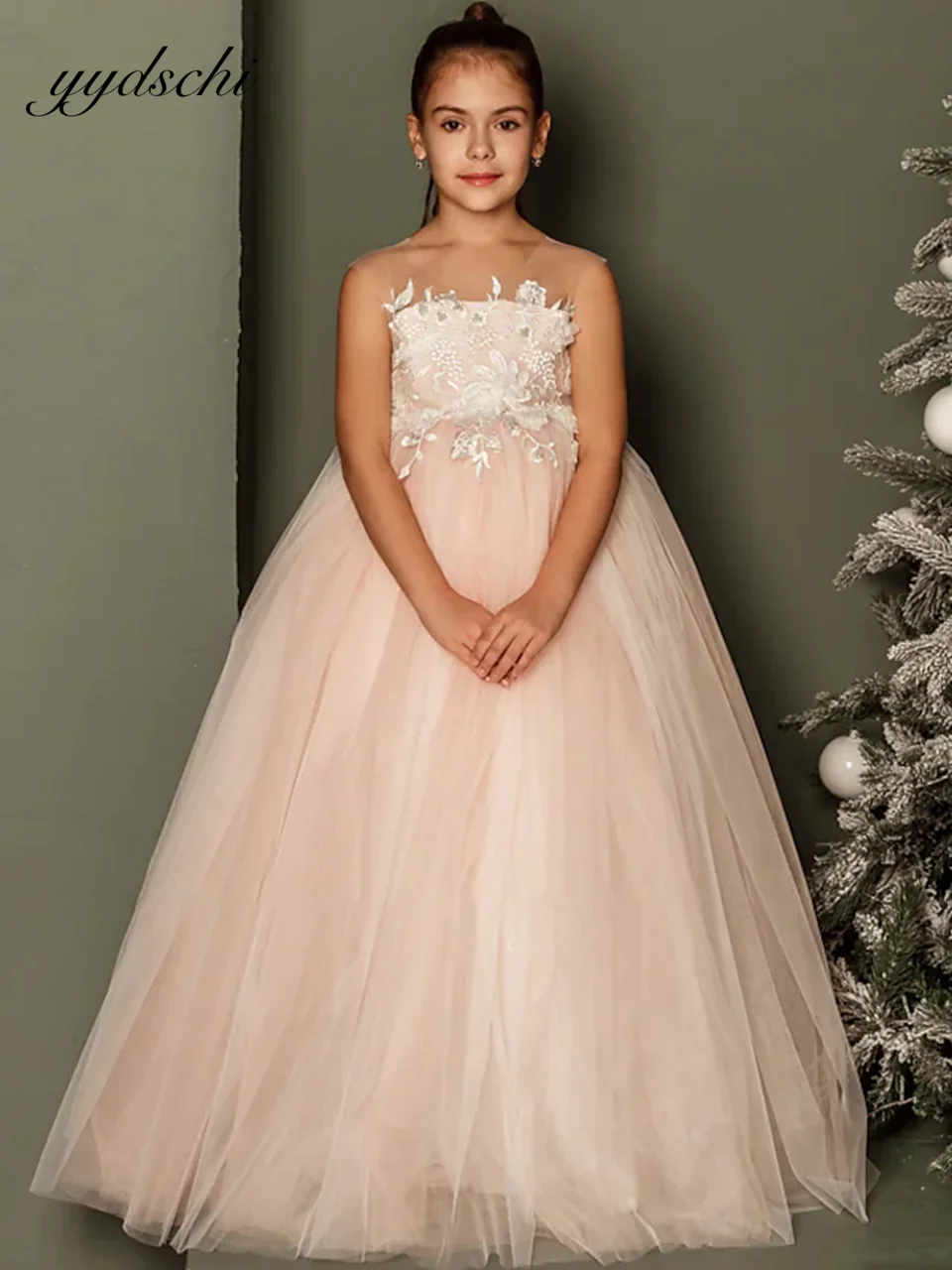 Pink Flower Girl Dresses For Wedding Tulle Appliques Ball Gown Sleeveless Toddler Pageant Gowns Birthday First Communion Dresses
