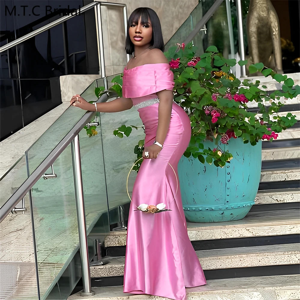 Pink Long 2025 Mermaid Bridesmaid Dresses Off The Shoulder Crystals Belt Satin Shiny Maids Of Honor Gowns Customized