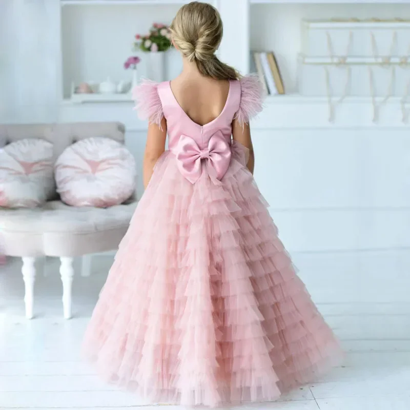 Pink Satin Tulle Puffy Tiered With Bow Sleeveless For Wedding Birthday Banquet Holy Communion Gown Customized Flower Girl Dress