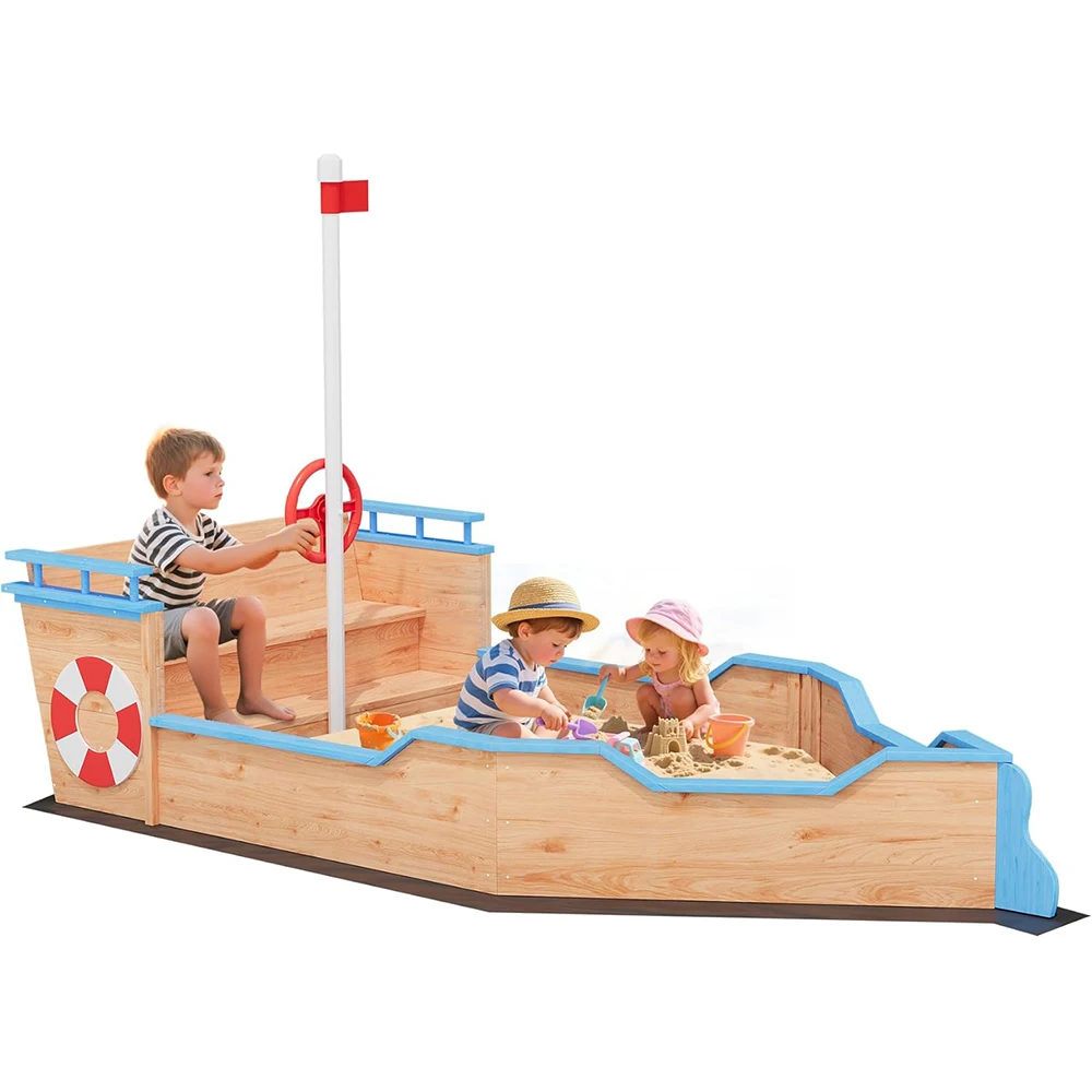 Pirate Ship Wooden Sandbox, Outdoor Sand Box with 2 Bench Seats, Bottom Liner, Kids Sandpit Boat w/Rudder, Realistic Flag, Buoy