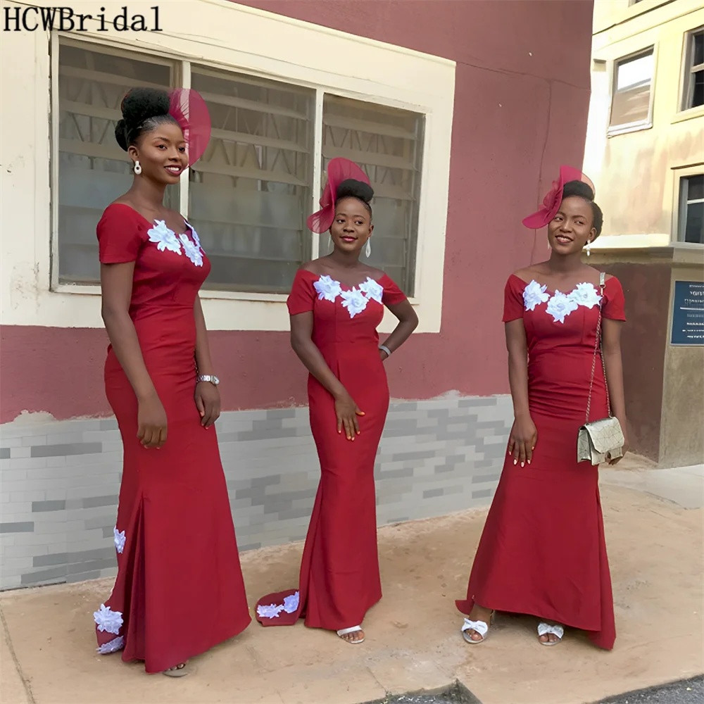 Plus Size Long 2025 Bridesmaid Dresses White Appliques Short Sleeves Satin Mermaid Wedding Guest Gowns Customized Cheap