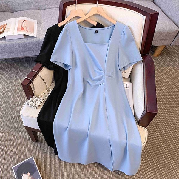Plus size, summer design sense dress with square collar and waist cinching, women's pleats 200 pounds, mm long skirt 3401