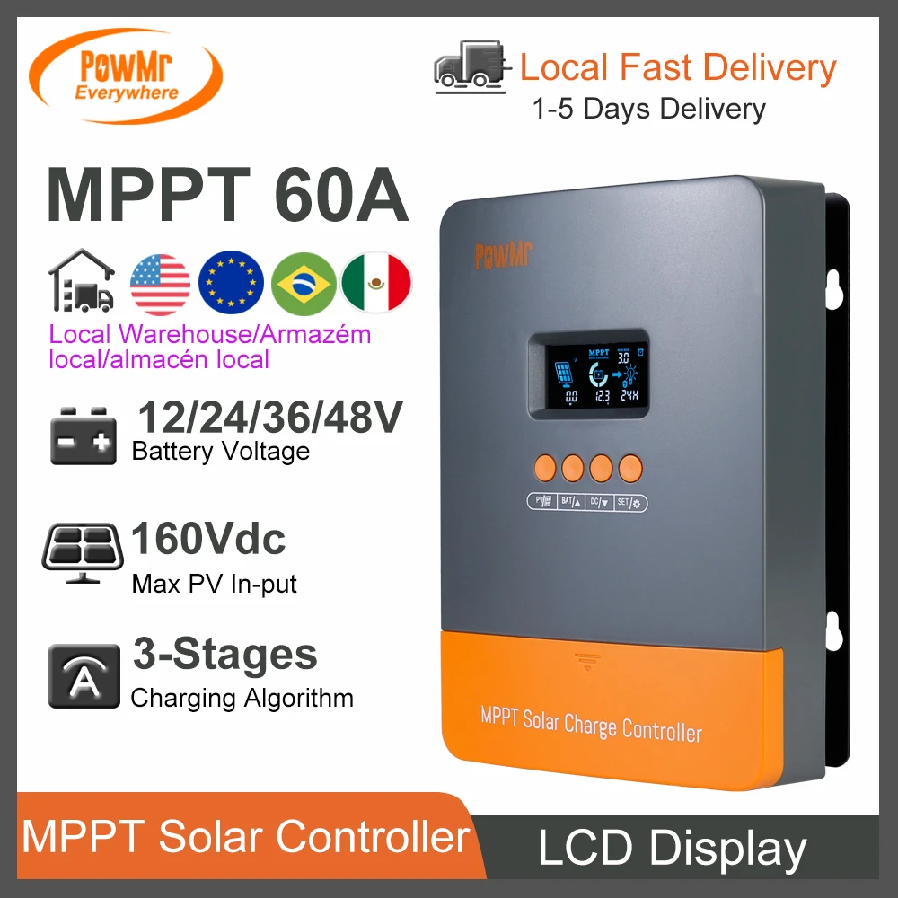 PowMr MPPT Solar Charge Controller 60A 12V/24V/36V/48V Auto Backlight LCD Display Solar Panel Regulator and Max PV Input 160Vdc
