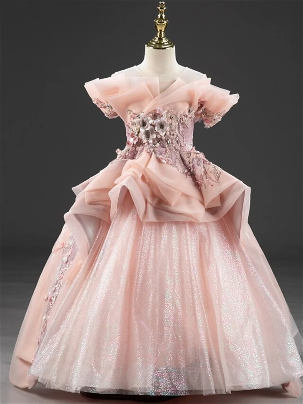 Princess Flower Girl Dresses Floor Length Party Faux Pearls Appliques Flowers Gorgeous Sweet Girls Bridesmaid Ball Gowns
