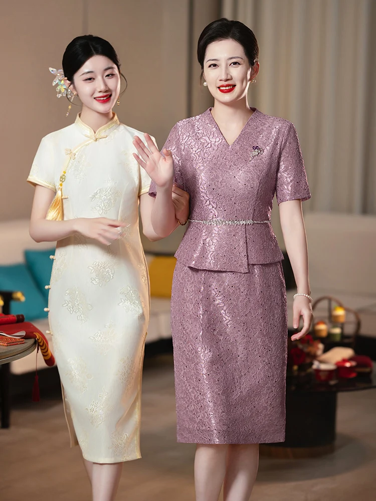 Purple Mother Of The Bride Dresses Elegant V-Neck Tea-Length Wome Sheath Dresses For Wedding Party Mom Evening Gowns 2024