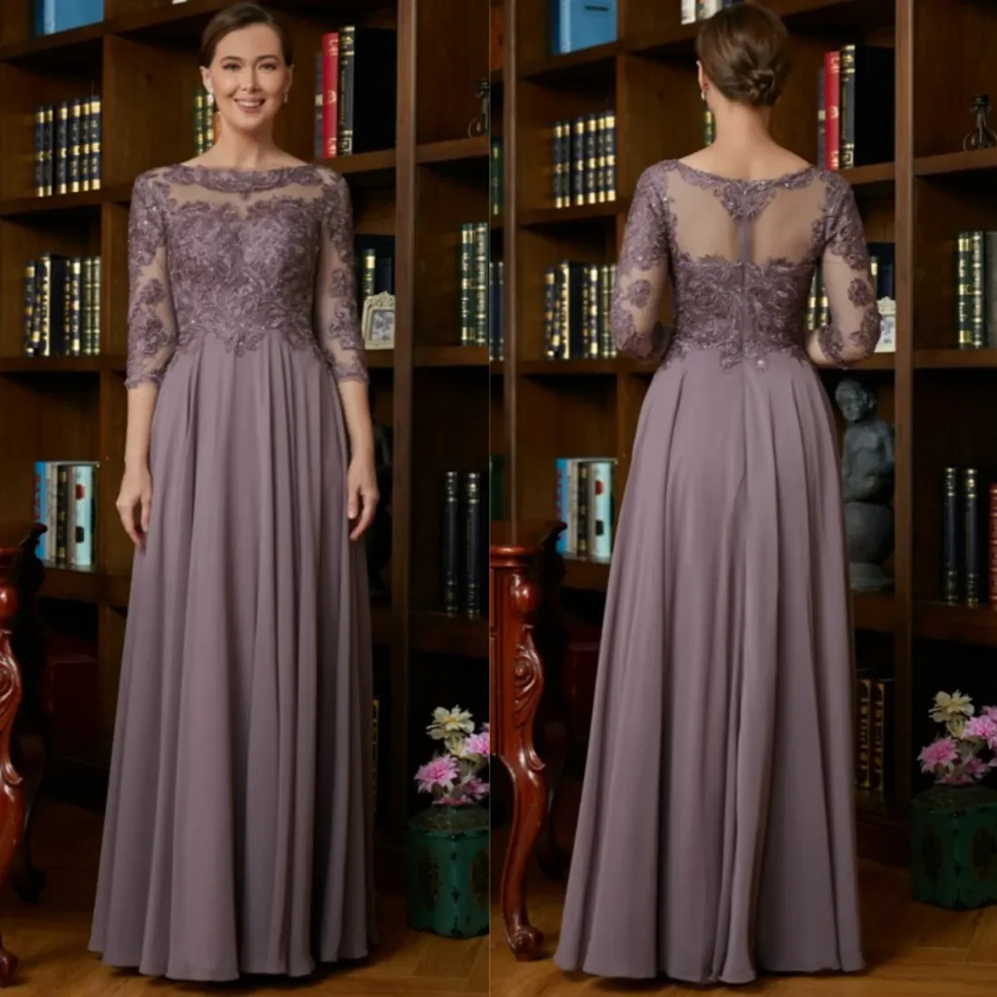 Purple Mother Of The Bride Gowns 3/4 Sleeves Sheer Neck illusion Appliqued Lace Beaded and Sequined Dress Customized