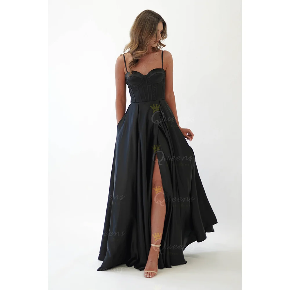 QueensLove Black Bridesmaid Dress Sweetheart Evening Dress Satin Long Straps Party Dress Backless Spaghetti