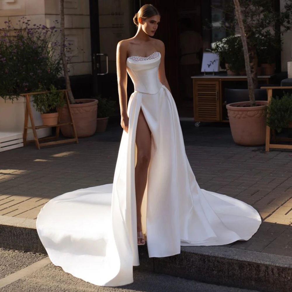 Romantic Hall Wedding Dresses Satin A-line Wedding Party Dress White Sweetheart Pearls Pleat Side Split Tailing Wedding Dress