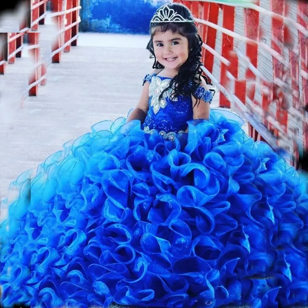 Rustic Royal Blue Flower Girls Dresses Off the Shoulder Ruffles Kids Birthday Party Gown Crystal Ball Gown Kids Pageant Dress