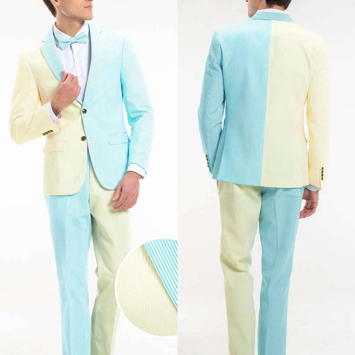 Seersucker Stripes Summer Men Suits Contrasting Colors Groom Wear Party Prom Jacket Wedding Tuxedos 2 Pieces Pants Sets