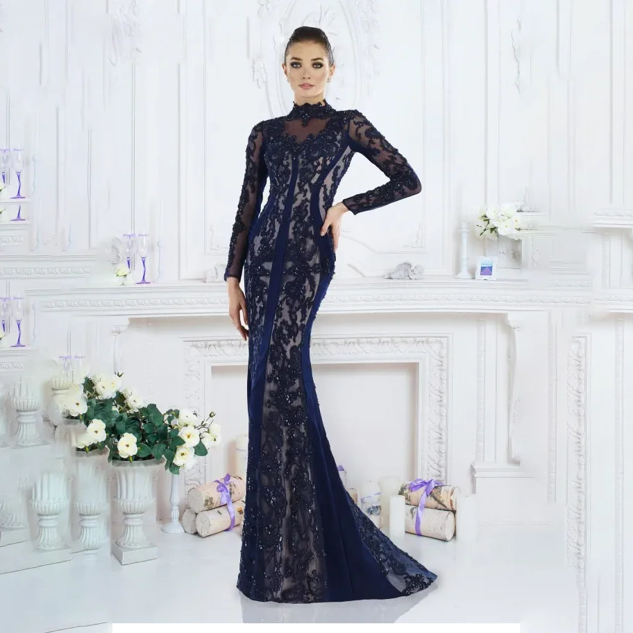 Sexy Mermaid Mother of The Bride Dresses High Neck Long Sleeve Lace Applique Crystal Wedding Guest Dress