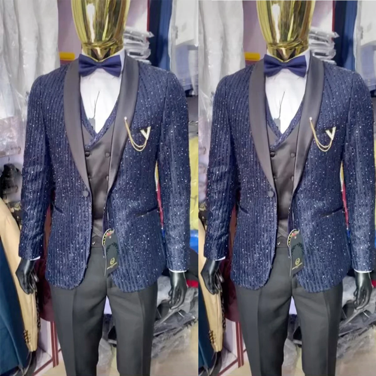 Shiny Sequins Wedding Tuxedos For Men 3 Pcs Regular Fit Shawl Lapel Groom Suits Formal Wear Prom Party Show Pants Suits