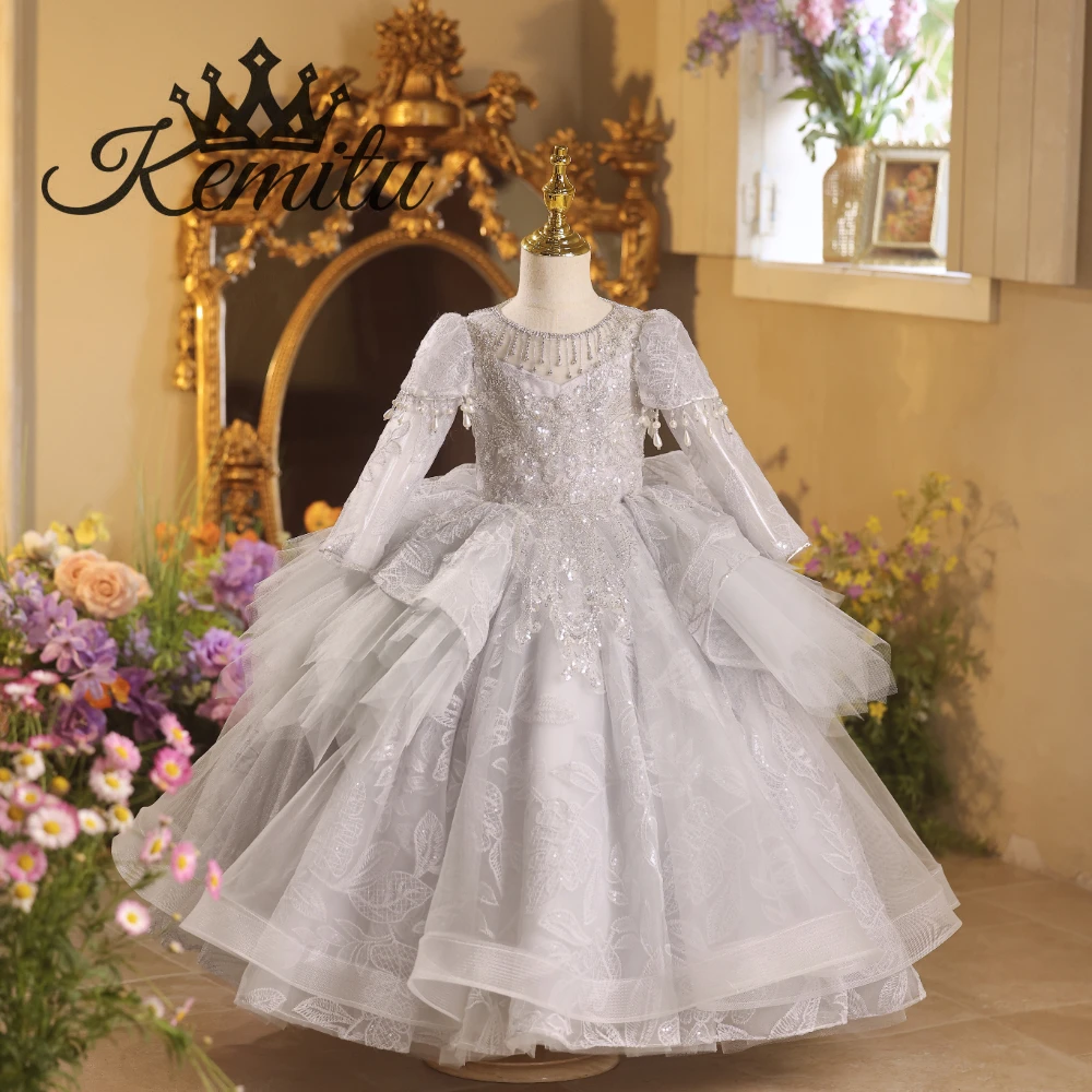 Silver Grey Flower Girl Dress with round Neck Long Sleeve Ball Gown for Beauty Pageant Customizable
