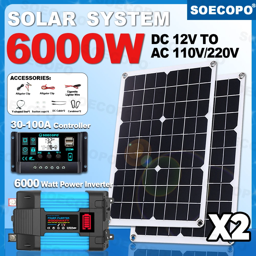 SOECOPO 6000W Camping Solar Kit Home DC 12V – AC 110V/220V Inverter Off Grid Solar System 100A Controller USB 5V/1.5A Panel