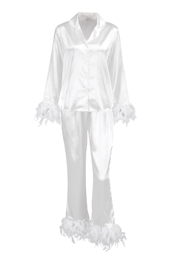 Summer Europe and the United States ice silk pajamas fashion ostrich hair shirt long pants loose two-piece feather home wear female