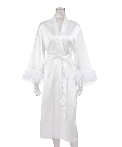 Summer pajamas female cardigan feather satin robe loose cross-border long section of Europe and the United States bathrobe ladies home wear
