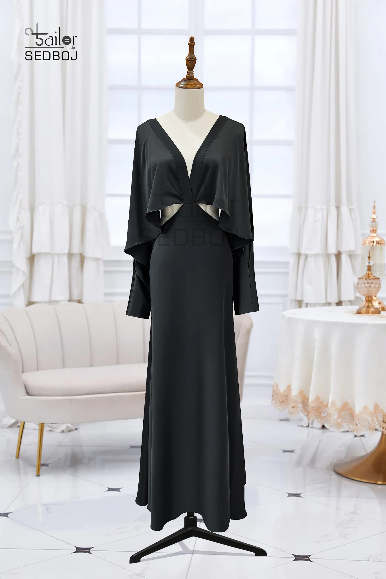 Tailored black silk fishtail exposed navel evening gown for brides