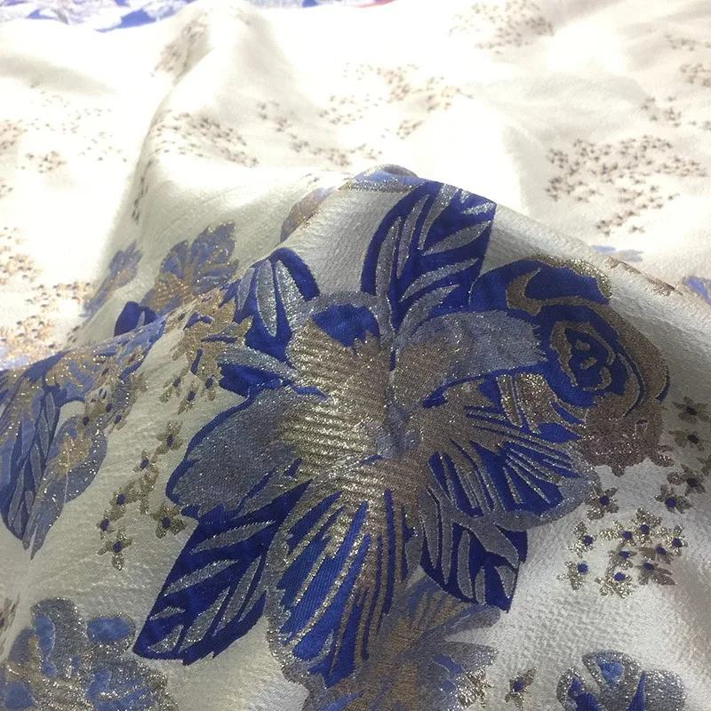 The jacquard dress for evening is made of fashionable gold silk brocade fabric