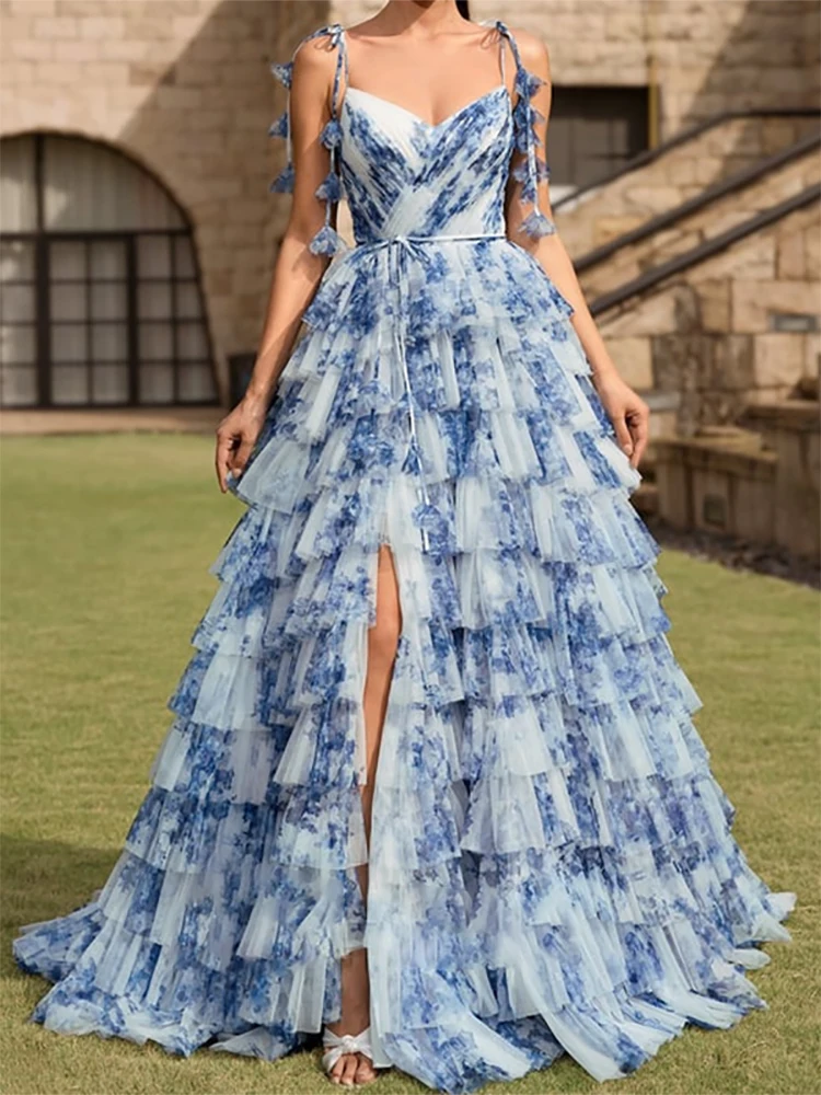 V-Neck Sweep Train Tulle Pleated 3D Floral Prom Gowns Formal Evening Dresses Customed