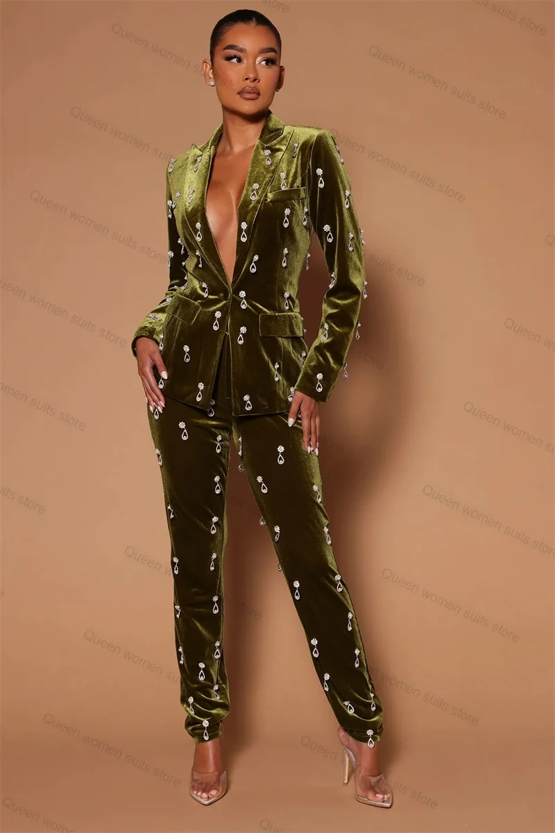 Velvet Crystals Wedding Women Suit Set 2 Piece Blazer Sexy V Neck Jacket Coat Formal Office Lady Guest Prom Trousers Customized
