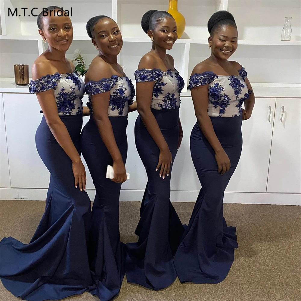 Wholesale Long Navy Mermaid Bridesmaid Dresses For Black Women Off The Shoulder Short Sleeves Appliques Satin Wedding Party Gown