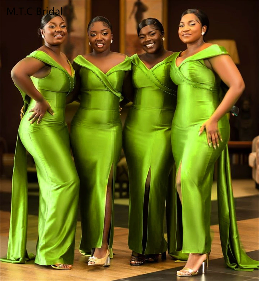 Wholesale Mermaid Long 2024 Green Bridesmaid Dresses V Neck Off The Shoulder Beading Satin High Quality Maids Of Honor Gowns